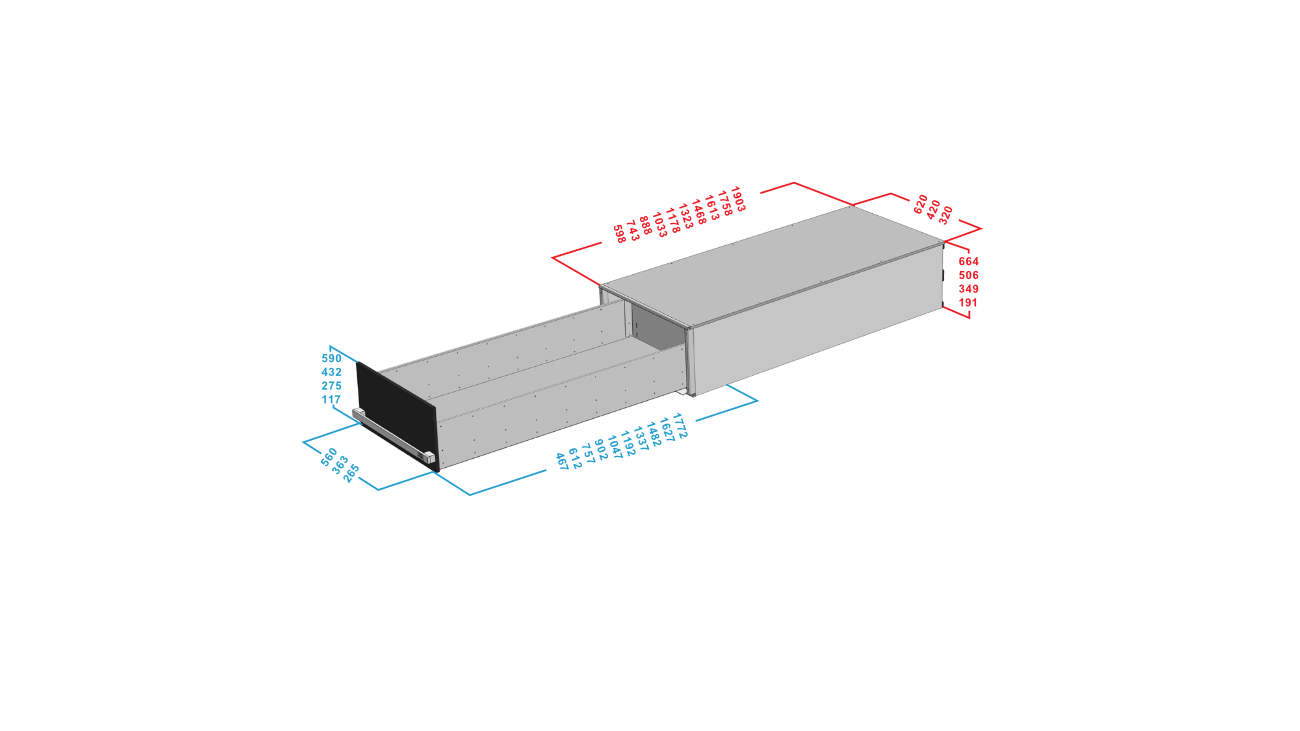Hier besteht die Option, die Schubladen oder Auszüge auf die Tefe und Breite des vorhandenen Kofferraums zu wählen.